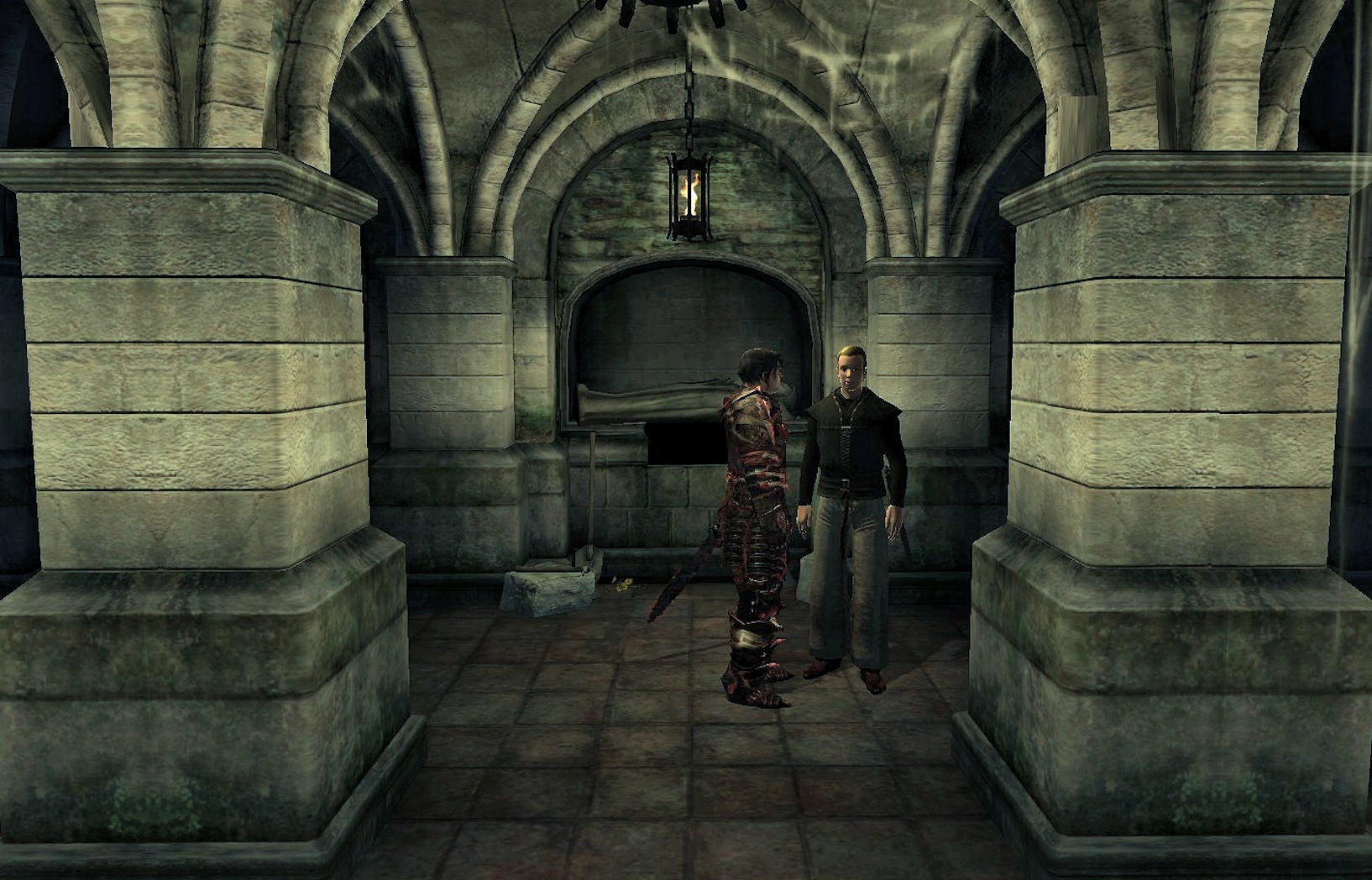 I've located Agarmir inside the Trentius Family Mausoleum. It appears as though he's attempting to desecrate another grave along with someone else I don't recognize. I need to convince him to stop this heinous act. |