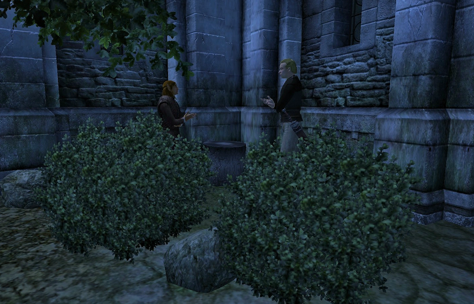 Eventually Thoronir will walk back toward his shop. Instead of going inside, he turns down a nearby street. Just behind the shop is a small lawn where he will meet with his supplier, Agarmir. Sneak to the tree closest to Thoronir and walk along it to initiate the conversation. Thoronir and Agarmir argue about the goods Agarmir has been bringing to Thoronir lately. When they are done talking they go their separate ways.